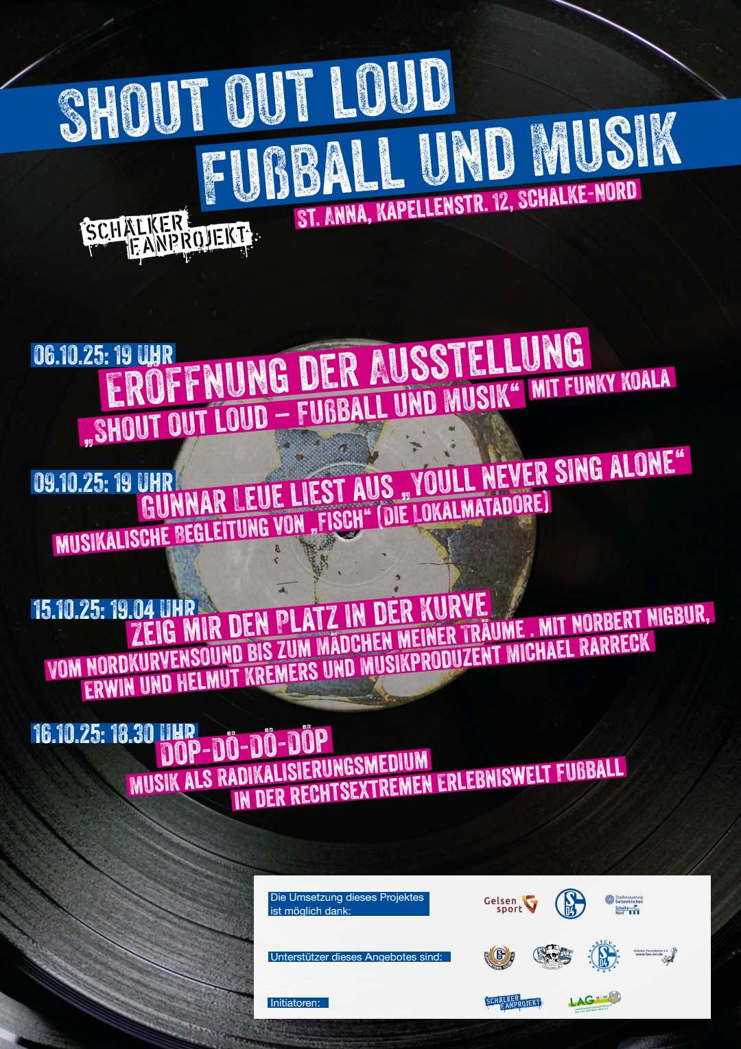 Gefördert durch den Quartierfonds Schalke-Nord, den FC Schalke 04 und Gelsensport. Mit Unterstützung von Supportersclub e.V., Anno 1904 e.V., Schalker Fan-Initiative e.V. und dem Schalker Fan-Club Verband e.V. Initiiert durch die LAG der Fanprojekte und das Schalker Fanprojekt.Kontakt: